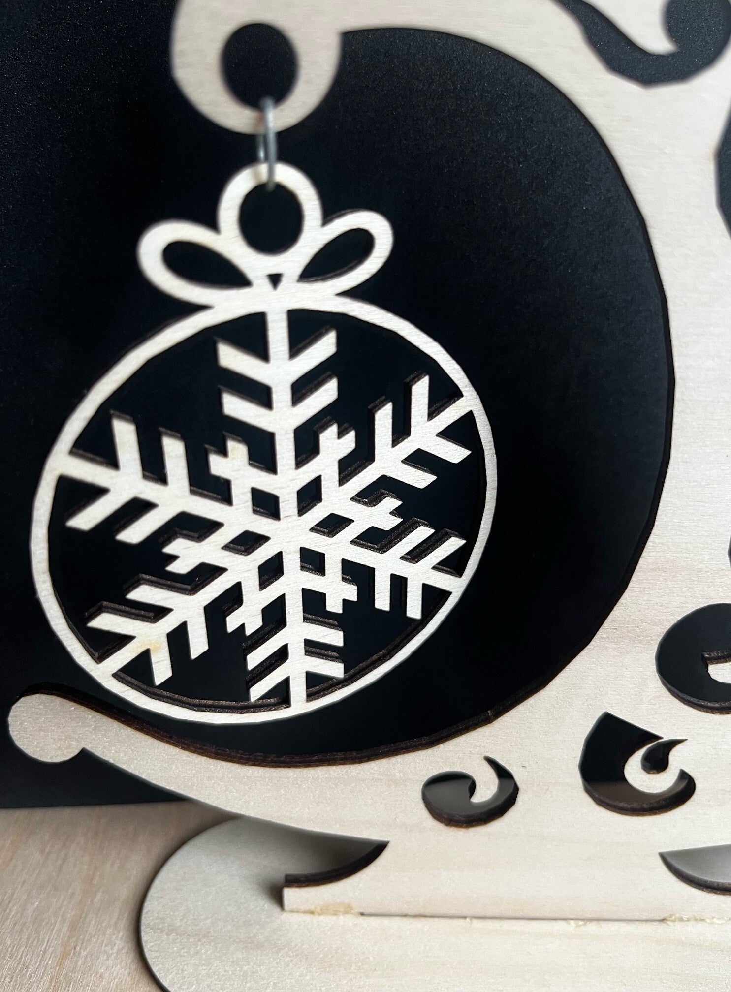 Von mir gelaserter kleiner Weihnachtsbaum mit Platte und Schneekristall.